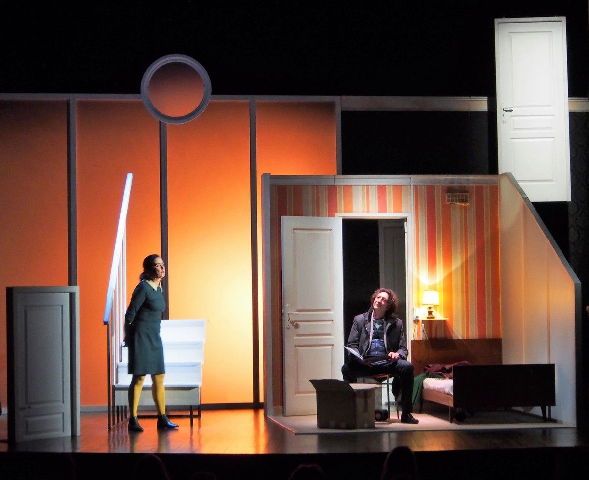 Dans "Ricochets", la dernière création théâtrale d’Alex Selmane, qu’il joue avec Denise Barreiros, directrice de la Compagnie "Là-bas Théâtre", le metteur en scène nous invite au rêve, au souvenir d’enfance, à l’éternel recommencement. À partir de deux textes "coup de cœur" choisis dans le répertoire jeune public de l’écrivain norvégien Jon Fosse, "Noir et humide" et "Kant", la pièce prend la forme d’une fable, sorte de troisième histoire, qui invoque les souvenir de deux adultes sœur et frère, revenus le temps de la pièce dans leur maison d’enfance. Pendant une heure, un travail sonore et visuel remarquable s’installe autour de ces personnages, mi adultes, mi enfants, et de toutes ces choses qu’ils ne comprenaient pas, quand ils entraient alors pour la première fois dans l’univers de leurs peurs. La création sonore d’Eric Guennou et la création lumière de Philippe Catalano rendent la scénographie émouvante et efficace pour nous promener d’un univers à l’autre, mêlant à la fois le concret de la maison d’enfance, avec son lit, ses lampes, ses portes, à celui, plus abstrait, onirique, de l’univers du souvenir, "de l’espace mental" expliquera Alex Selmane lors de la rencontre avec des lycéens qui fit suite à la représentation. Le décor imaginé par Daniel Fayet est sensoriel. Ici, un bout de porte, là, une lune suspendue, des escaliers qui ne finissent jamais… En fond sonore des bruits de pas, des voix, bizarres, rythmiques, mêlant joies et hantises, "comme on lance une pierre, qui rebondit, sans qu’on sache où ça finit" confie l’artiste.